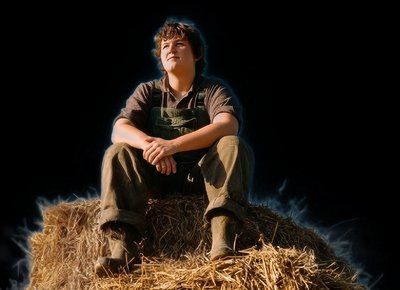 Person auf Heuballen vor blauem Himmel
